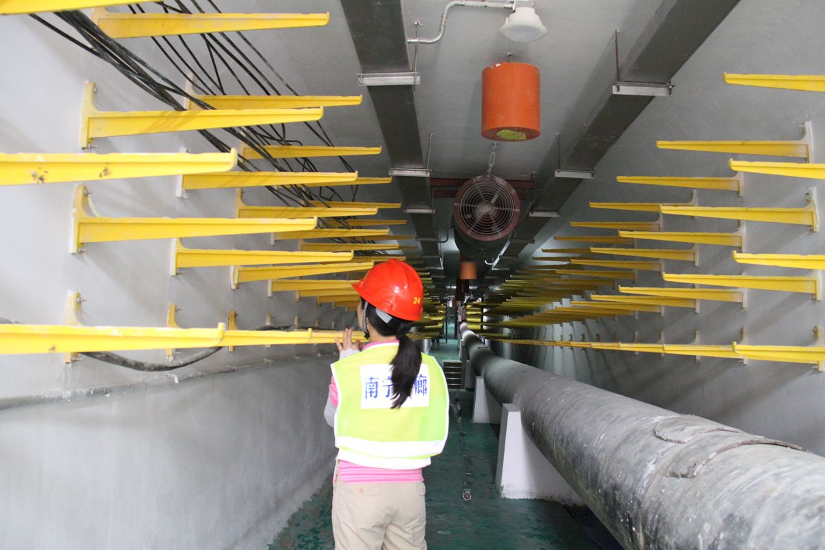 因为管廊全部为地下作业,大埋深处14米。走在管廊内,体感凉爽但是有些潮湿。整个管廊宽处有5米,两侧各延伸着长长的白色管道,上面是一条绿色细管道。整个环境看上去明朗整洁,人走在里面一点不压抑,而且管道的照明系统非常完善,感觉不出是走在地下。