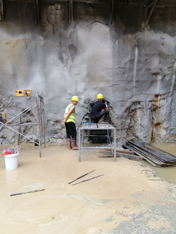 以下为基坑止水失效止水桩间管涌堵漏施工现场: